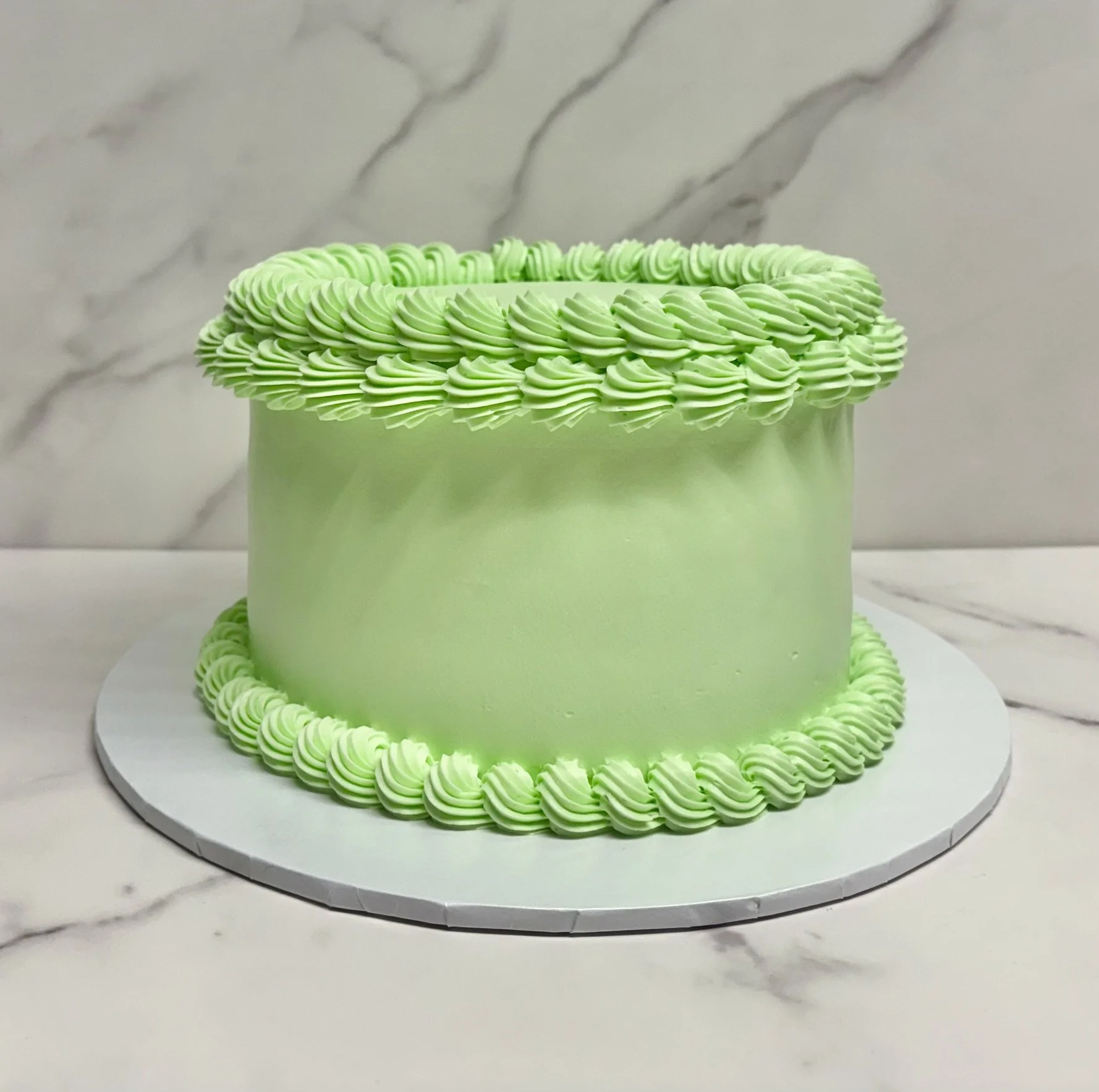 Classic cakes are made in one of our classic flavors and decorated in our classic design (some variation of top, side and bottom borders in the flavor's corresponding color, similar to the pandan cake pictured in this section).
